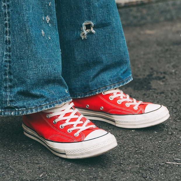 足元はレッドの『コンバース』スニーカーをオン。ヴィンテージライクなデニムとも好マッチ!