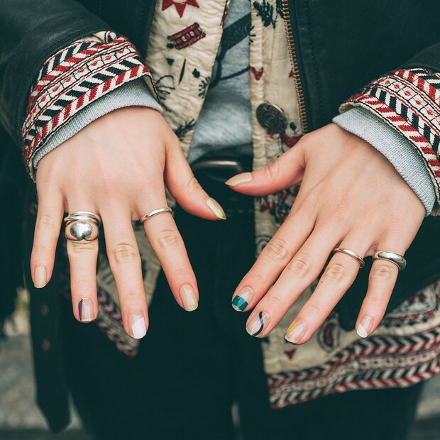 手元はシルバーアクセサリーでまとめて、メリハリを演出。幾何学的なネイルでユニークな一面を出したのも見逃せない。
