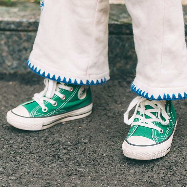 ブランドシェアしたスニーカーを、キッズは爽やかなグリーンをチョイス。春が待ち遠しくなる足元に昇華!