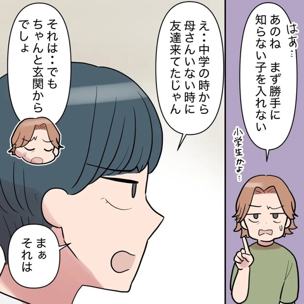 「はぁ・・あのね、まず勝手に知らない子を入れない」小学生かよと思いながらそう言うと、「え・・中学の時から母さんいない時に友達来てたじゃん」とミズキが反論。「それは・・でも、ちゃんと玄関からでしょ」私の言葉に、「まぁ、それは」とミズキが渋々答えました。