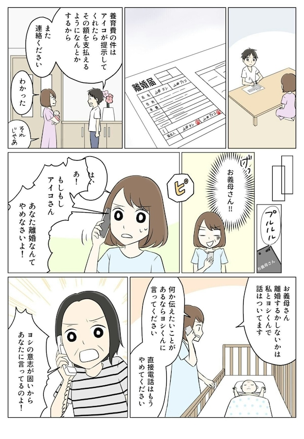 離婚が成立し変わろうとしている夫に対し、義母は相変わらず家族なんだから援助は当たり前という考え…。さらには「離婚したら養育費なんて払われなくなる」と脅しのようなことまで言ってきました。シングルマザーの義母はそうだったのかもしれませんが、ヨシも同じようになるとは限りませんよね。むしろ、そうならないように見守るべきなのに、アイコに対してそんな心無いことを言ってくることが残念ですね。