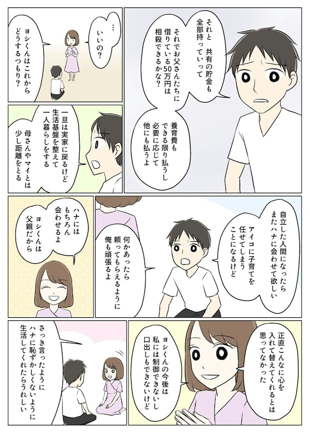 アイコの父とヨシが別室に行き、2人きりで話をすること2時間…。ヨシは戻ってくるなり、アイコに土下座して謝り、これまで夫婦でいてくれたことに感謝の気持ちを伝えました。そして、お金や家族に関する考え方が間違っていたことにようやく気付いたと話します。アイコがこれまで何度も話してきたことでしたが、アイコの父に改めて話をされようやく気付いてくれたようです。