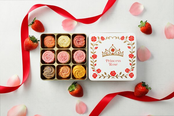 主役の「苺のエアリーサンド」が薔薇の花が咲いたように缶の中央に並び、両側には主役にも劣らない華やかなカラーの「果実香る紅茶のクッキー」を配置。まるで花束をもらったような気分になる華やかなデザインで、ギフトにも最適だ。