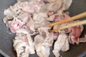 3. 熱したフライパンに油を少し入れて豚肉の薄切りを炒め、塩コショウで軽く味をつけます。