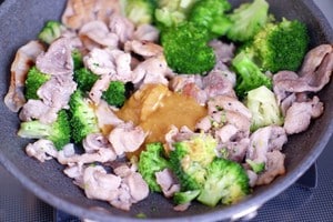 4.豚肉に火が通ったら、レンジで加熱したブロッコリーと合わせ調味料を入れて、全体を混ぜて味がよく絡んだら完成です。