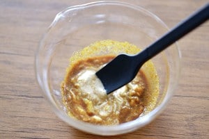 2. マヨネーズ、ウスターソース、カレー粉などを器に入れてかき混ぜ、合わせ調味料を作ります。