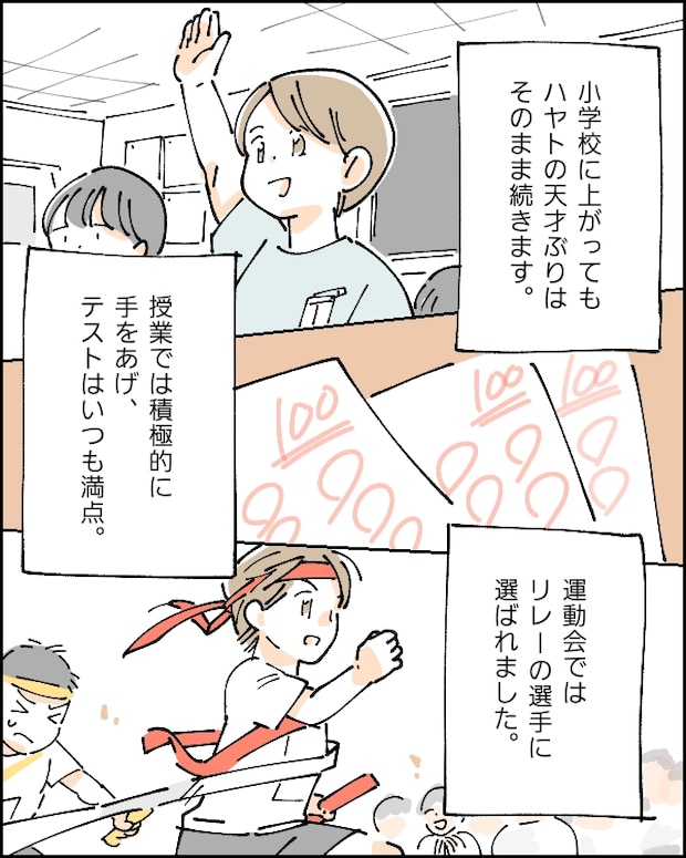 小学校に上がっても、ハヤトの天才ぶりは継続。授業では積極的に手をあげ、テストはいつも満点。運動会ではリレーの選手に選ばれるほどでした。