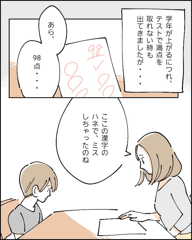 「あら、98点・・ここの漢字のハネでミスしちゃったのね」ある日、返された国語のテストを見て、マイナスされた2点のミスを指摘した私は、