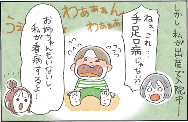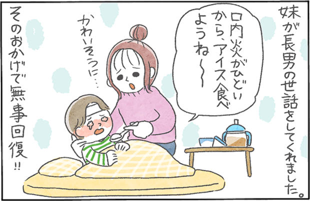 里帰り出産のため、ママさんが1歳になる長男くんを連れて実家に帰省した時のこと。ママさんが入院中、運悪く長男くんが手足口病を発症し、甥っこを心配した妹さんが看病をかって出てくれたそうです。ところが、その後見事に妹さんにも感染!子どもの病気は大人にうつると重症化しやすいと言われますが、この出来事から数年が経っても忘れられないほど苦しんだのだとか。 手足口病は夏だけでなく、冬でも感染の可能性がある病気です。子どもだけでなく、大人も油断は禁物ですね。