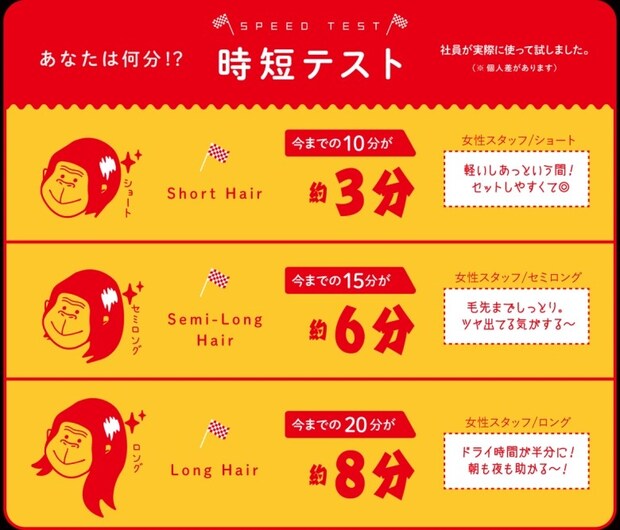 パッケージ側面にはスタッフによる時短テストの結果が明記。なんと、ショートヘアならたったの3分!今までよりもドライ時間が圧倒的に早いというコメントがたくさん。もちろん個人差はありますが、期待できそうですよね。