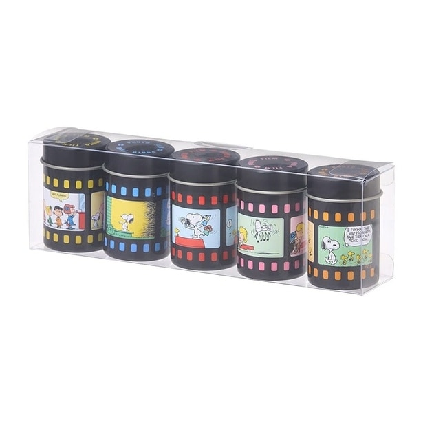 35ミリフィルムのフィルムケースをイメージした筒缶に、クランチチョコを封じ込めた「スヌーピー PEANUTS EUREKA エウレカ 写真フィルム缶」(972円)は、5缶セット。ばら撒きチョコにもぴったり。