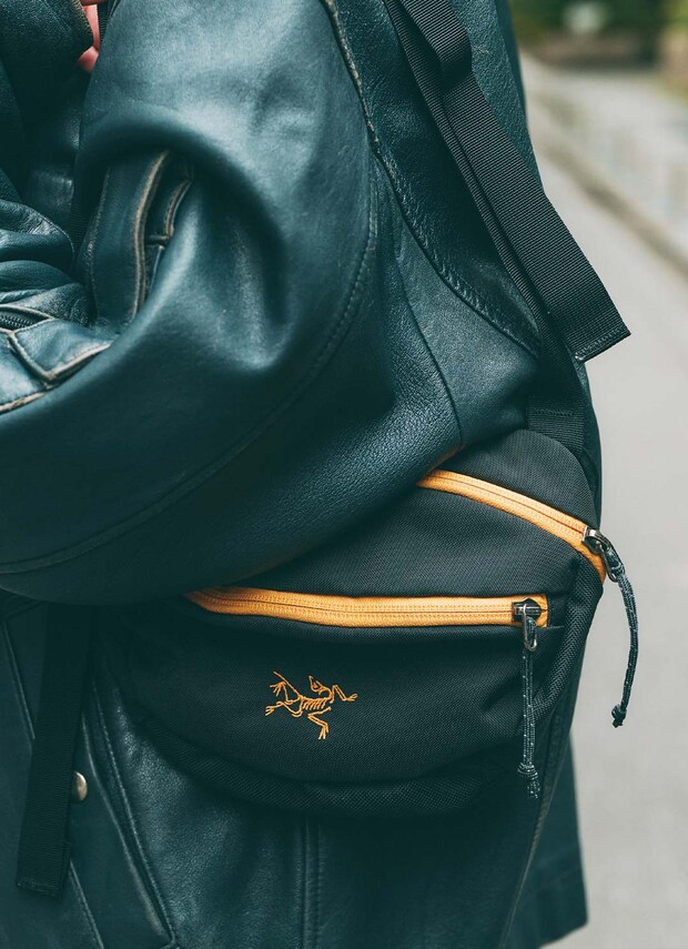 『アークテリクス』のバッグはオレンジのジップがポイント。機能美あふれるテック系アイテムで冬のお出かけスタイルをアップデート♪