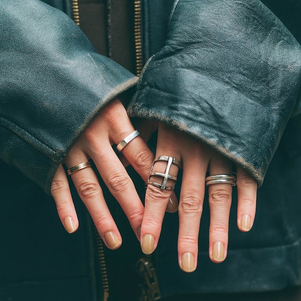 シルバーリングがクールなアクセント役に抜擢。加えてライトベージュのネイルカラーで、洗練された手元の完成♪