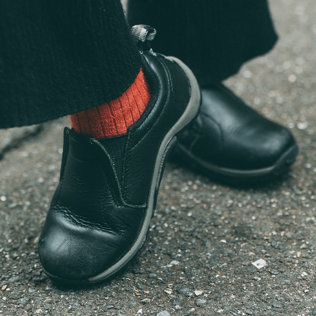 『メレル』のモックシューズは、ブラックレザーで大人っぽく。歩きやすいソールだから、元気いっぱいなキッズでも履きやすい一足。