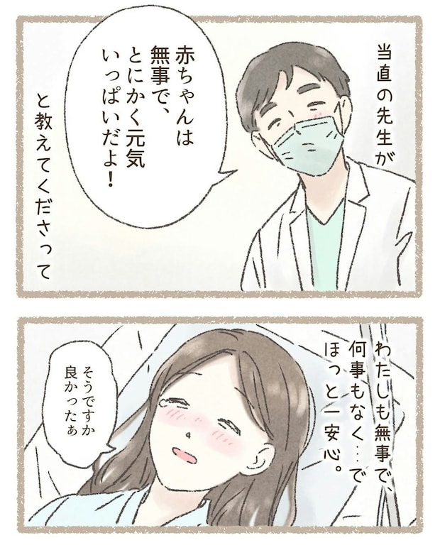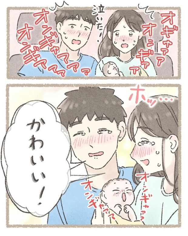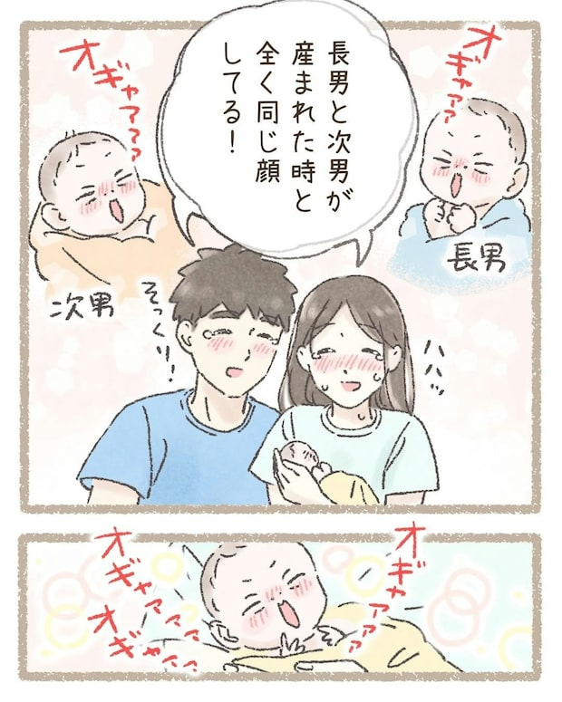 わこさんが落ち着いて対応したことで、赤ちゃんは泣き始め、呼吸も無事に整いました。ほっと安堵の表情を浮かべるわこさん夫婦。そのとき、泣いている赤ちゃんの顔が、長男や次男が生まれたときとまったく同じだということに気づくのでした。