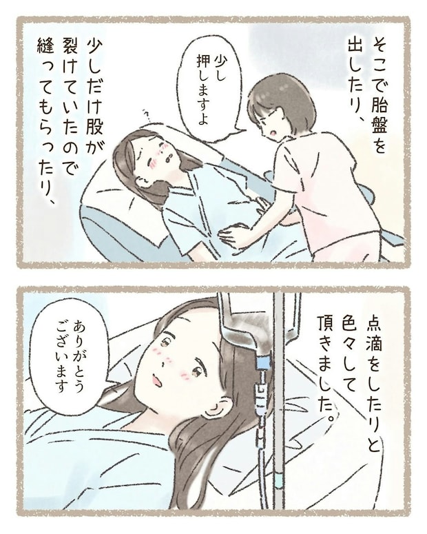 分娩台で胎盤を出し、会陰の縫合などの処置を受けながら、点滴につながれて横になるわこさん。当直の先生から、赤ちゃんが無事で元気いっぱいだと聞かされ、母子ともに大きなトラブルなく出産を終えられたことに、ようやく心から安堵するのでした。