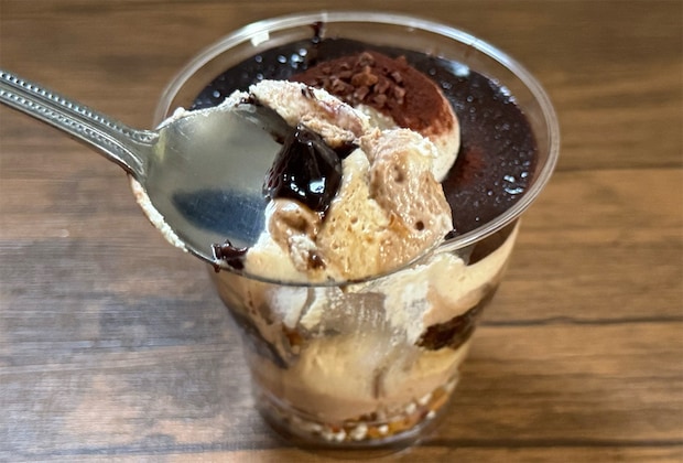 さらに食べ進めるとほんのり苦いコーヒーゼリーとクリームの組み合わせや、最下層のサクサク食感が楽しめます。