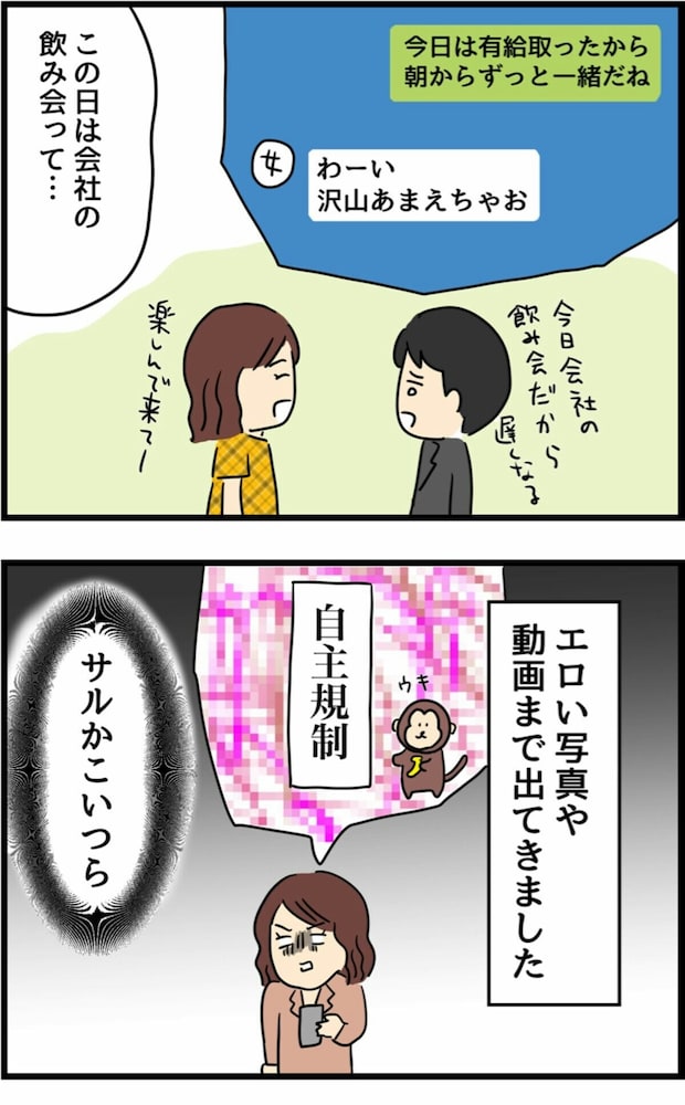 さらにやりとりを読み進めていくと、会社の飲み会だと言っていた日に夫は有給を取り、不倫相手をいたことが発覚。他にも、スマホからは生々しい写真や動画まで見つかります。