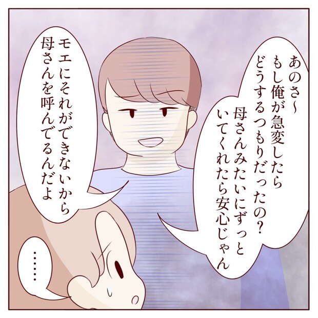 マサキから「看病してほしい」と言われてやってきた義母。息子に頼られたことが嬉しいのか、義母はお泊まりセットやエプロンを持参するなど準備万端でやってきて「マサキのことは私が看るから安心して」とにっこり。義母は過剰なほどマサキを心配し、まるで小さな子どもの看病をするように何から何まで面倒を見る始末。翌日、熱も下がりすっきりした顔で起きてきたマサキは、私の前でわざと「やっぱり母さんに来てもらえてよかったよ。モエは全然看病してくれないからさ」と義母に言いました。