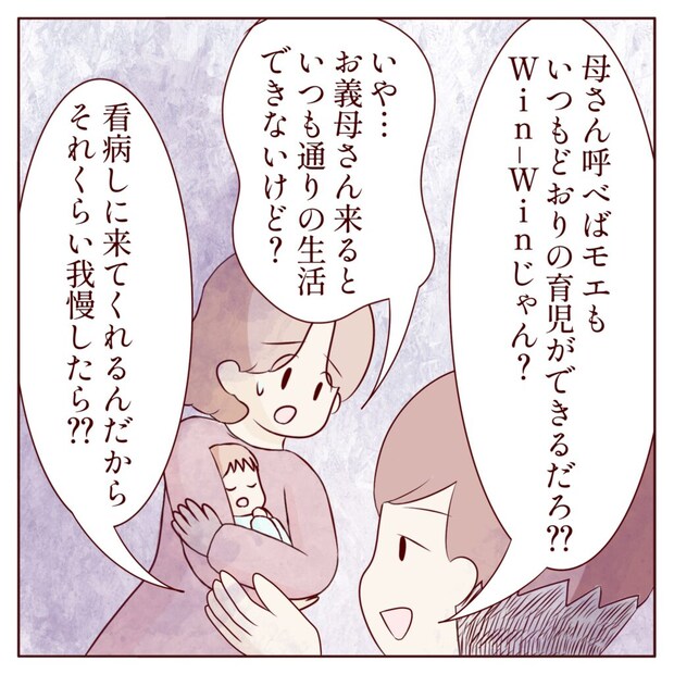 すると、「母さん呼べばモエもいつもどおりの育児ができるだろ??WinWinじゃん?」ドヤ顔でそう言うマサキに、「いや・・お義母さん来るといつも通りの生活できないけど?」私がそう言うと、「看病しに来てくれるんだからそれくらい我慢したら??」と言うマサキ。