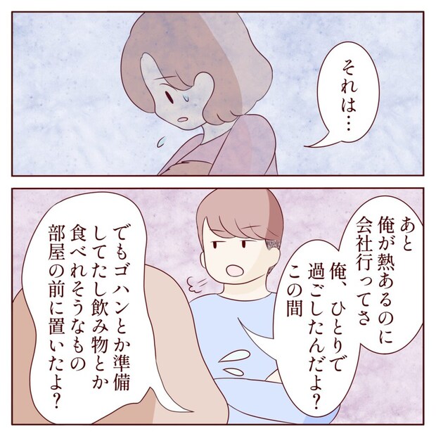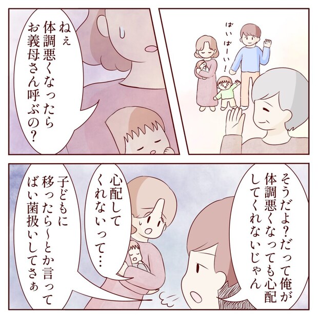 「ねぇ、体調悪くなったらお義母さん呼ぶの?」私がそう言うと、「そうだよ?だってオレが体調悪くなっても心配してくれないじゃん」マサキにそう言われ、「心配しれくれないって・・」と驚くと、「子どもにうつったら~とか言ってばい菌扱いしてさぁ」と文句を言うマサキ。