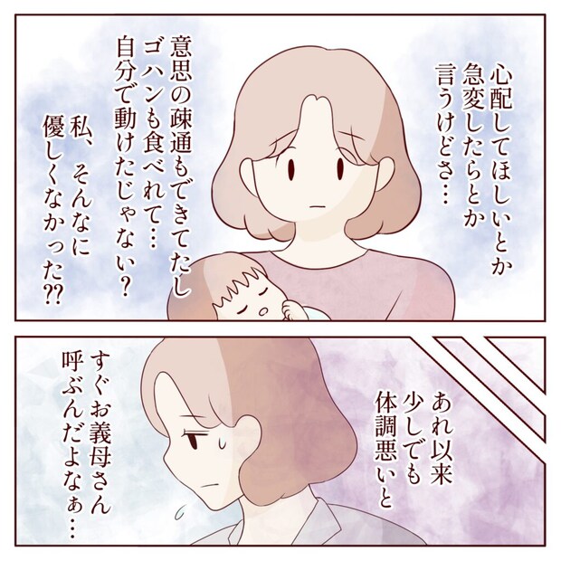「心配してほしいとか急変したらとか言うけどさ・・意思の疎通もできてたし、ゴハンも食べられて・・自分で動けたじゃない?私、そんなに優しくなかった??あれ以来、少しでも体調悪いとすぐお義母さん呼ぶんだよなぁ・・」と心の中で呟きました。