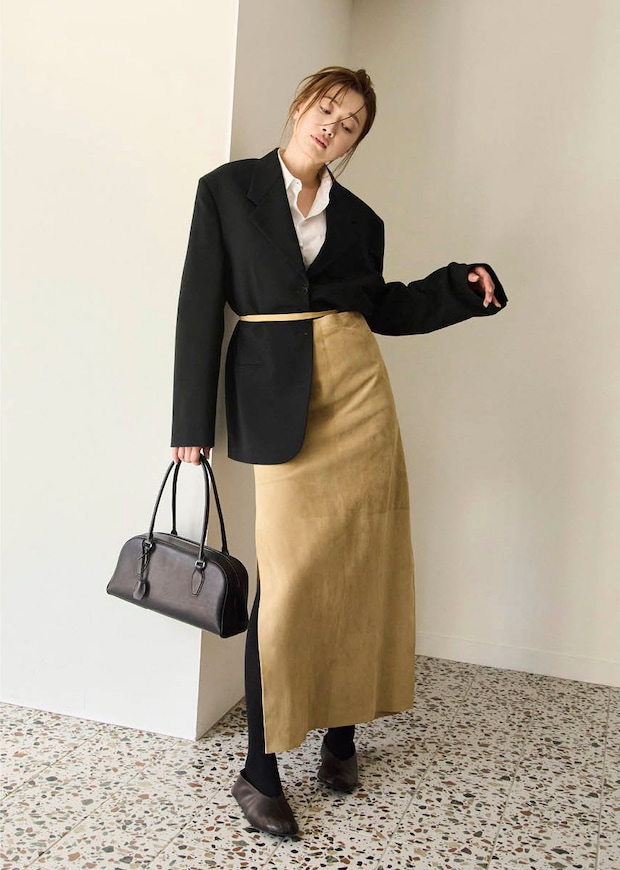 バッグ〈E/W インディア〉[H17×W34×D13.5㎝]¥784,300、シューズ〈ステラ スリッパ〉[ヒール0㎝]¥198,000、ジャケット¥776,600、シャツ¥181,500、スカート¥828,300、タイツ¥136,400(全てザ・ロウ/ザ・ロウ・ジャパン)