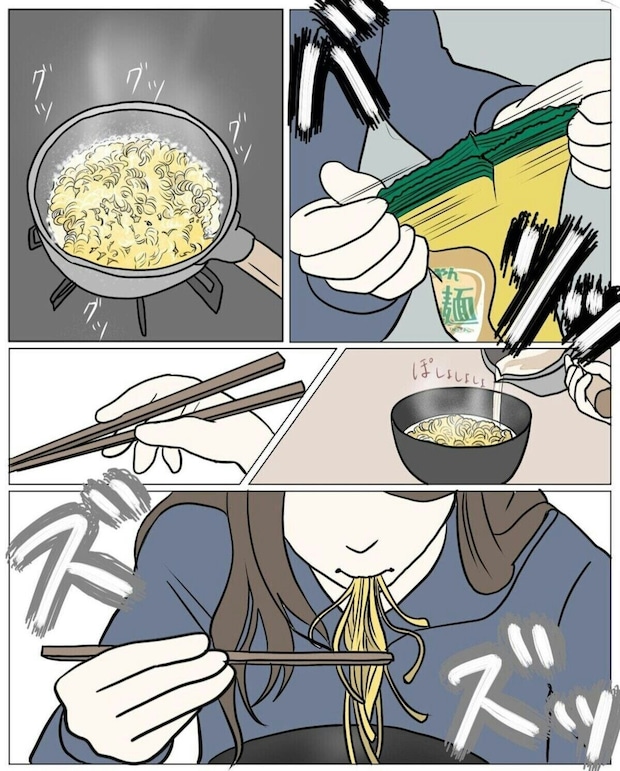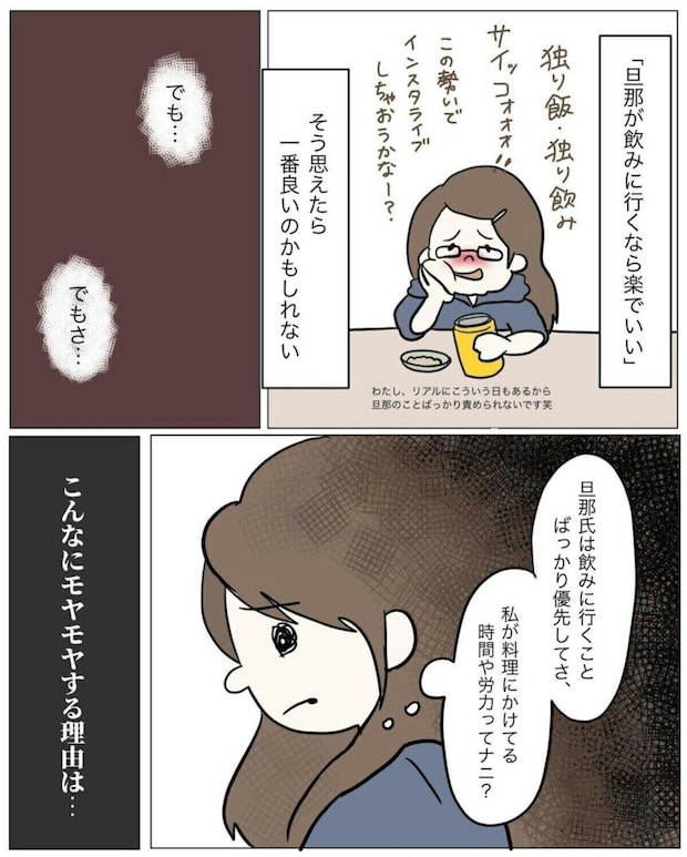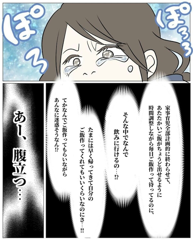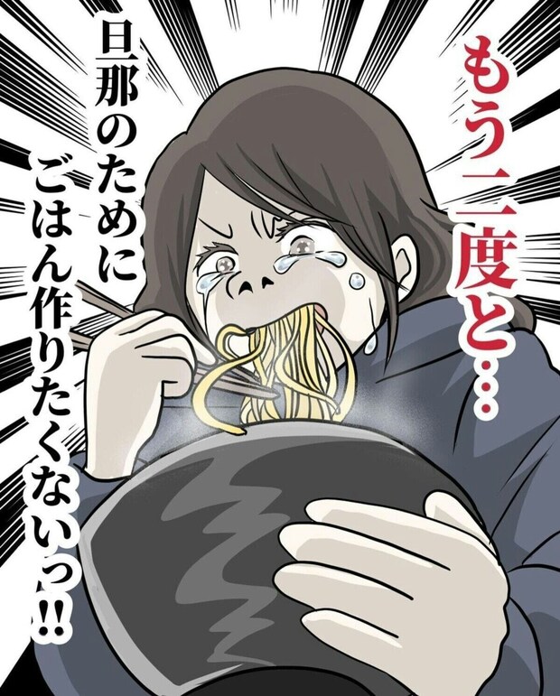 飲み会連絡が続いた夫に「食事は外で済ませて」と連絡し、1人インスタントラーメンを食べた、たまままさん。これまでため込んでいた夫への不満がわき出てきます。「二度と夫のためにご飯を作りたくない」とまで考えるように。