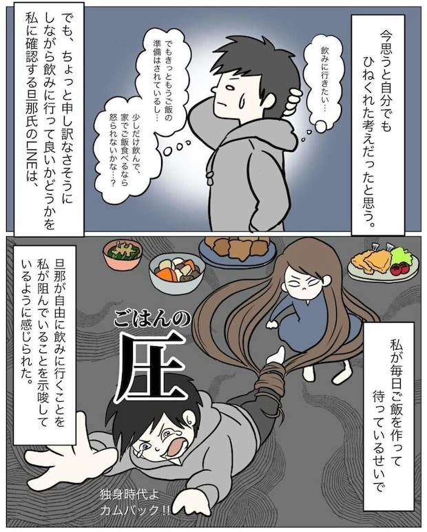 妻が作った食事が出てくるのが当たり前で、飲みに行ったら次の日に食べれば怒られない…夫はそんな考えでいるように感じ、イライラが止まらなくなったのではないでしょうか。