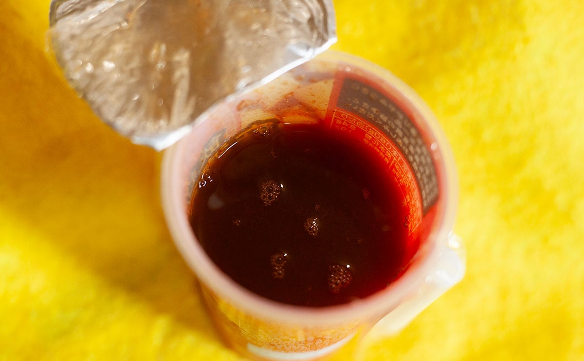 真っ赤な液体が入っていますね。見た目だけで言うなら、麻婆豆腐を作るときに使う「素」がそのまま入っているみたいな感じ。ちなみに、カップの底にはひき肉と細かく切られた豆腐が沈んでいる(ストローがぶっとい理由がわかりました……)ので、よく振ってから飲むことをおすすめします。