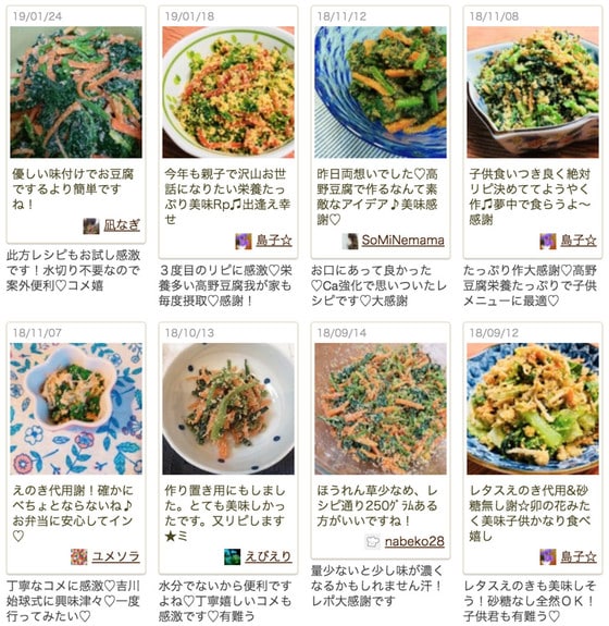 つくれぽ(つくりましたフォトレポートのこと)には「高野豆腐すりおろしいいアイデア!ベチャつきなく作り置きOK納得」など、豆腐の水切りの手間がいらないことに喜びのコメントが寄せられています。