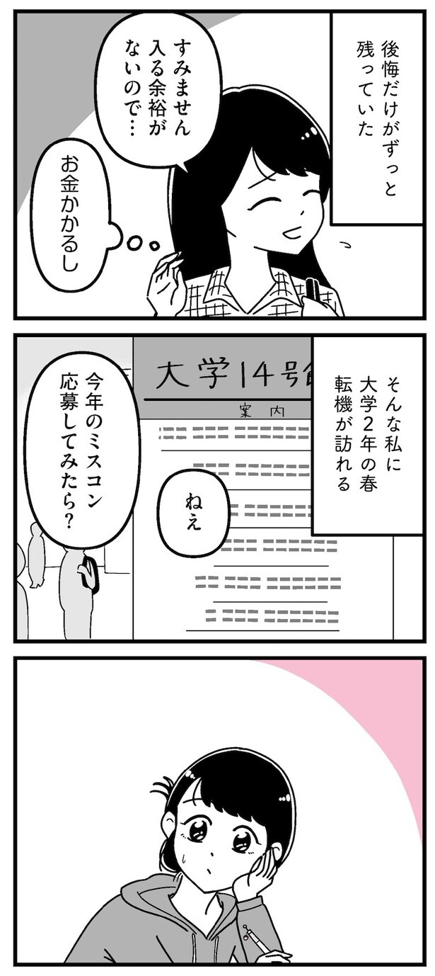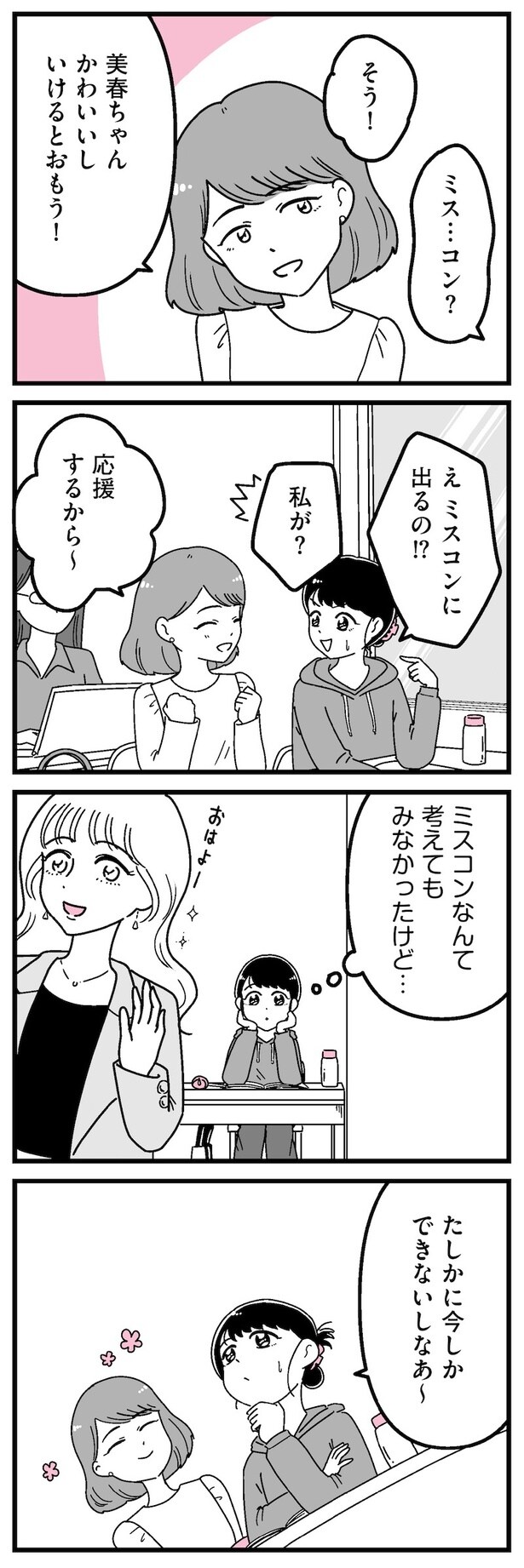 前回、いくら頑張っても周りの友達とは対等にならない現実に嫌気がさしていた美春。しかし、大学2年生になった頃、美春に転機が訪れる。桜子からミスコンを勧められたのだ…。