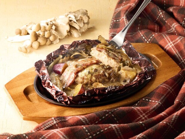 マッシュルームとオニオンの旨みが詰まったクリームソースが食欲をそそる、秋にぴったりな包み焼きハンバーグ。デュクセルソースをイメージしたクリームソースは、マッシュルームの香りとコク、オニオンの旨みが加わった奥深い味わい。たっぷりと入った舞茸としめじ、程よい塩味とスモーキーな香りの燻製ベーコンやごろっと入った優しい甘さのさつまいもが食感と味わいにアクセントを加える。きのこの旨みが溶け込んだ芳醇な香りのソースは、石窯パンなどと合わせて食べるのがおすすめだという。
