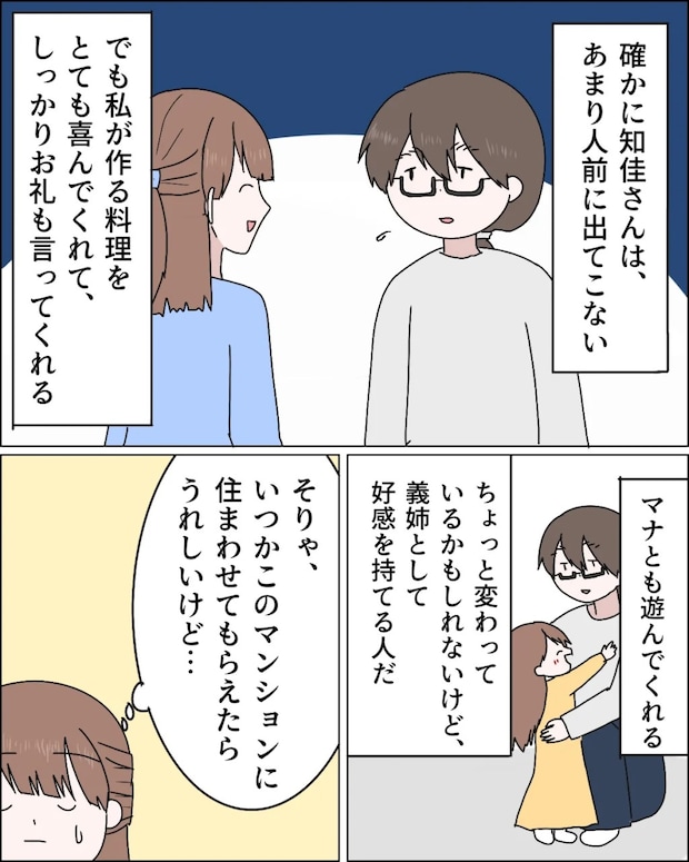 確かに、知佳さんはあまり人前に出てくるタイプではありませんが、私の作った料理をいつも喜んで食べてくれて、お礼もしっかり言ってくれます。少し変わっているところはあるかもしれませんが、正直なところ麻里さんよりもずっと好感の持てる人です。そりゃ、いつかこのマンションに住まわせてもらえたら嬉しいけど、知佳さんを追い出そうとする麻里さんの気持ちにまでは共感できませんでした。