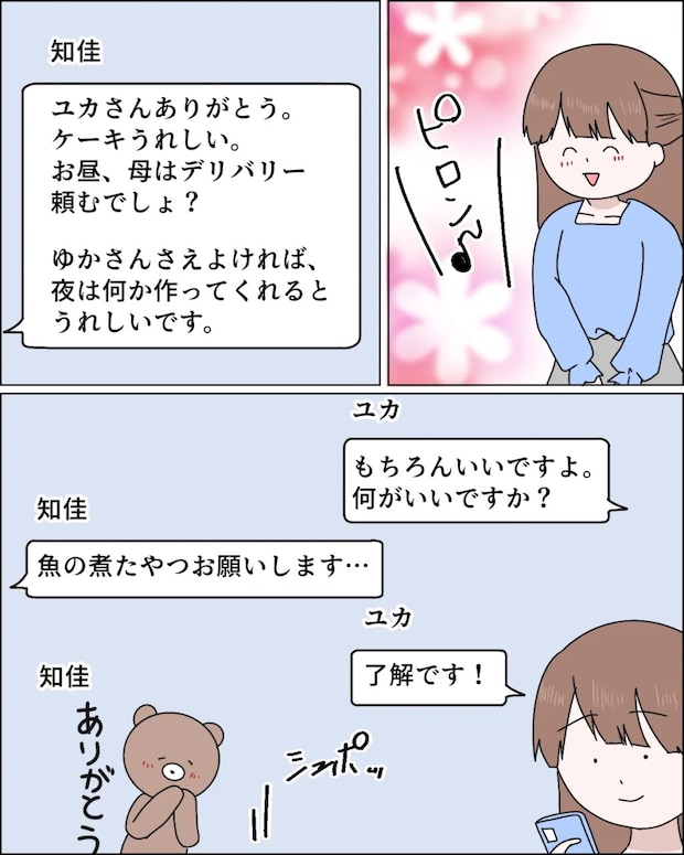 義母は料理が苦手で、普段から外食やデリバリーを利用することが多いみたい。そんな理由もあって、知佳さんは家庭的な味が食べたくなると、たまに私にリクエストを送ってくることがあるのです。私自身、料理は好きですし、知佳さんが「おいしい」と喜んで食べてくれるので、毎回とても作り甲斐を感じています。