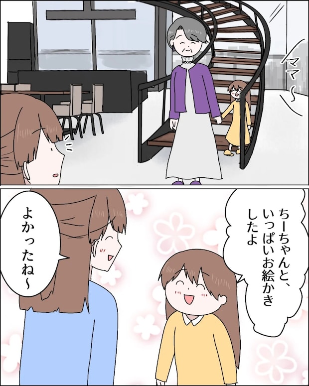 しばらくして、知佳さんのもとへケーキと紅茶を届けに行っていた義母とマナが戻ってきました。「ちーちゃんと、いっぱいお絵かきしたよ」嬉しそうに話すマナの笑顔につられて、私も思わず頬を緩めます。