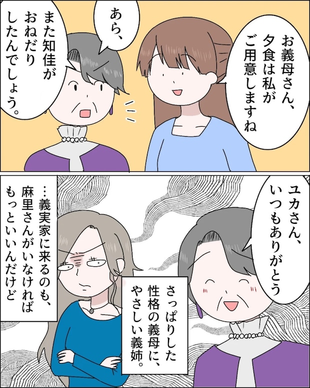 少し風変わりなところはあるものの、知佳さんはきちんと仕事をしていて、料理を作れば必ず感謝の言葉を伝えてくれる・・・人として筋の通った方だと感じます。それに比べて、よく知りもしない相手を一方的に貶す麻里さんの態度には、どうやっても好感を持てません。ユカさんの言う通り、麻里さんさえいなければ、義実家はもっと居心地のいいものになるのでしょうね。