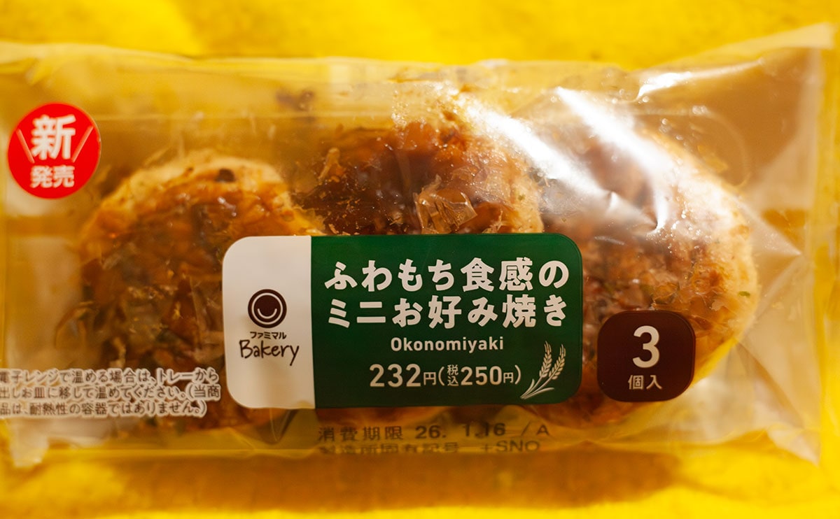 2026年1月13日(火)、ファミリーマートが発売したのが、「ふわもち食感のミニお好み焼き3個入」(税込250円)という新商品です。