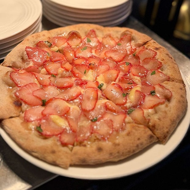 フォトジェニックな「窯焼き いちごピッツァ」も。スライスしたいちごをぎっしり敷き詰めていて、なんとも贅沢。デザートピザかと思いきや、甘じょっぱさもあって、クセになる味わいです。もう1枚食べたくなってしまいますね。