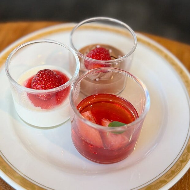 「いちごゼリー」も、ニューオータニを代表するスイーツのひとつ。ゼリーはぷるっと弾力があり、さっぱりとした味わい。フレッシュいちごとのバランスもいい感じです。