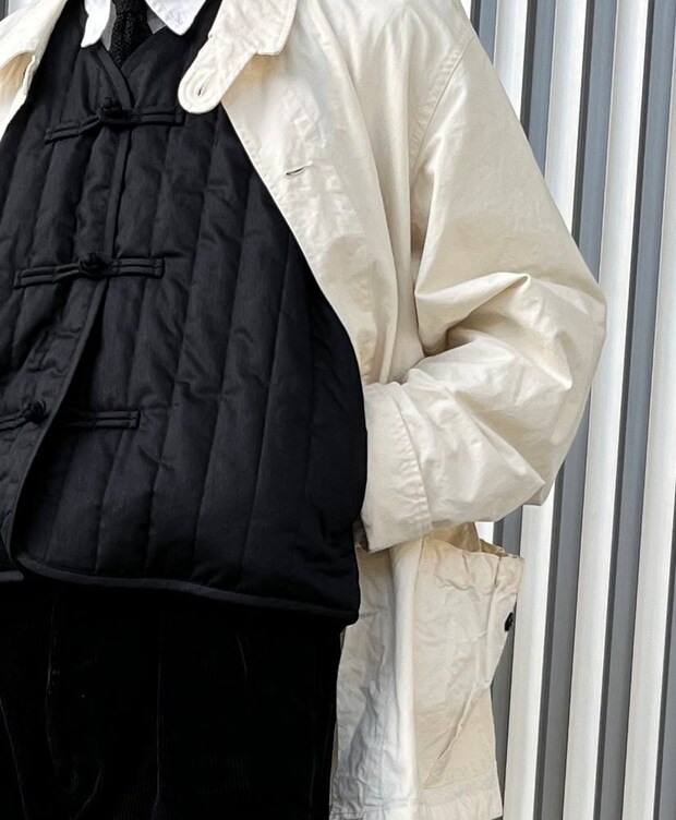 そもそもこんなに洒落たチャイナベストが【無印良品】にあったことに驚いたのですが、どうやら前立てにチャイナを採用したアイテムは定期的に展開しているそう。安武さんもひと目ボレだったそうで、「先日伺った展示会で、一番欲しいと思ったアイテムがこのベストだったんです」。安武的お気に入りポイントがいくつもあったようなので、まずはそちらを詳しく解説していきます。