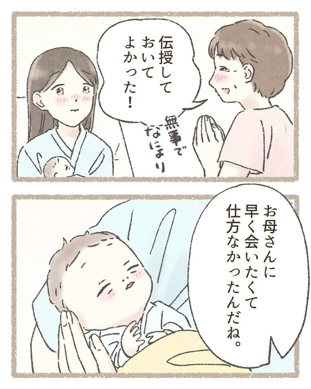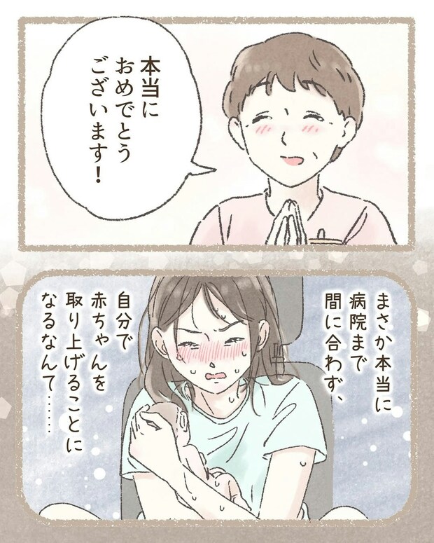 涙をにじませ、心からのおめでとうをわこさんに伝えてくれた助産師さん。もしも助産師さんからのアドバイスがなかったら、車内でパニックになって、何もできないままに出産をすることになっただろう…わこさんは振り返ります。