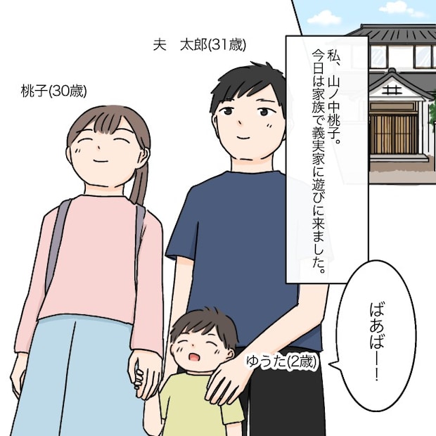 私は山ノ中桃子。夫太郎と2歳息子ゆうたの3人家族です。この日は家族で太郎の実家に遊びに来ました。太郎の実家は大きな日本家屋。ここに住んでいるのは太郎の両親とおばあちゃんの3人です。みんなゆうたをとてもかわいがってくれるし、初めて会った時から私にも優しい義家族です。