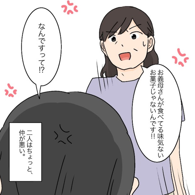 ゆうたのために用意したおやつに文句をつけられてイラっとした様子の義母が「お義母さんが食べてる味気ないお菓子じゃないんです!!」とさらに言い返すと「なんですって!?」と義祖母も黙っていません。私が知る限り、いつも2人は些細なことで喧嘩を始めるのです。