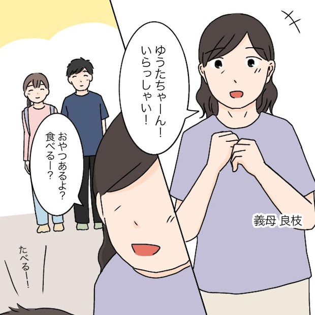 義実家に到着すると、さっそく笑顔の義母、良枝さんが出迎えてくれました。ゆうたの到着を楽しみにしてくれていたようで、「おやつあるよ?食べるー?」と嬉しそうです。