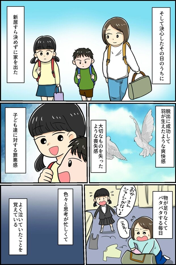 長い年月、主人公は夫からのモラハラに耐え続けようやく、子どもたちと家を出る決意をします。心残りや今後の不安など、思うことは尽きないかもしれません。