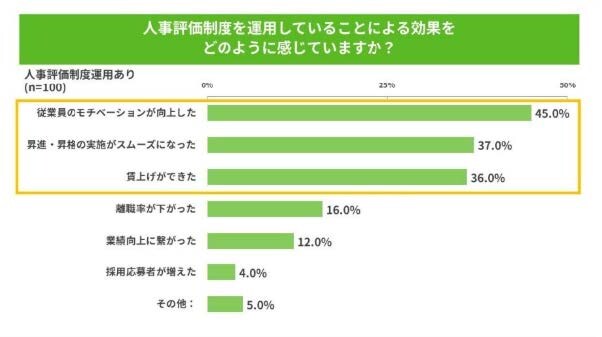一方で、人事評価制度を運用している企業では、明確な効果も確認されています。調査によれば、「従業員のモチベーションが向上した」と回答した企業は45.0%、「昇進・昇格の実施がスムーズになった」は37.0%、「賃上げができた」は36.0%にのぼりました。