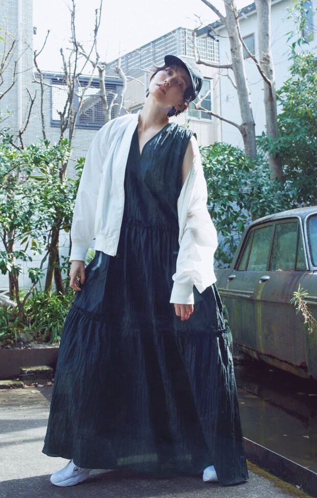 ティアードドレスの甘さとブルゾン&スニーカーのラフさ、モノトーンでまとめたモダンさのMIX加減が絶妙! 合わせ次第でどんなテイストにも染まるブラックドレスはやっぱり優秀。このままどこかにお出かけしたくなる♪