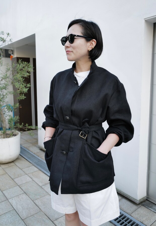 「シルエットやサイズ感、素材などこだわりの詰まったメンズ服やヴィンテージブランドが気になります。そのブランドのひとつがアナトミカ。このジャケットは、コットンリネンのキャンバス地を使用した、肉厚だけど軽やかな素材感が絶妙で気に入っています。デザインは、1940年代のイギリス海軍のジャケットがベース。同素材のワイドパンツもあり、セットアップでも着用しています。実はベルトマークしたのは、パンツの共布ベルト。ざっくりと縛りました」ジャケット¥52,800、ハーフパンツ¥31,900(共にアナトミカ)