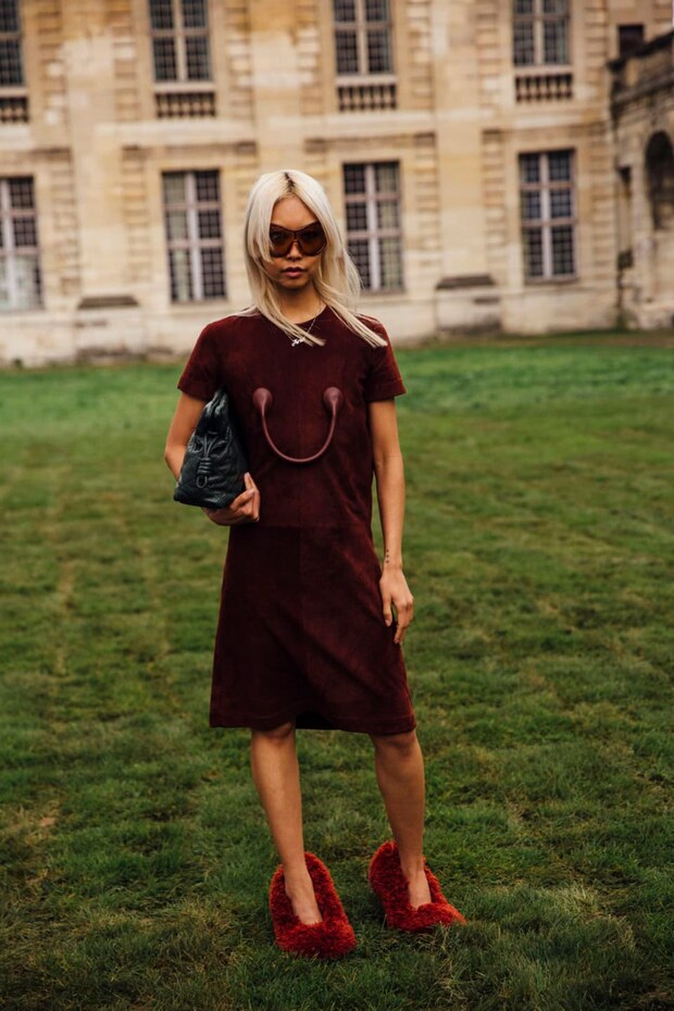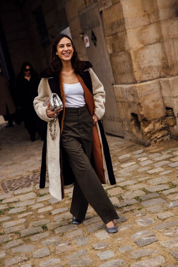 ロエベのショー会場でアレクサ・チャンをキャッチ。小脇に抱えたシルバーのバッグが、ほどよいアクセントに。